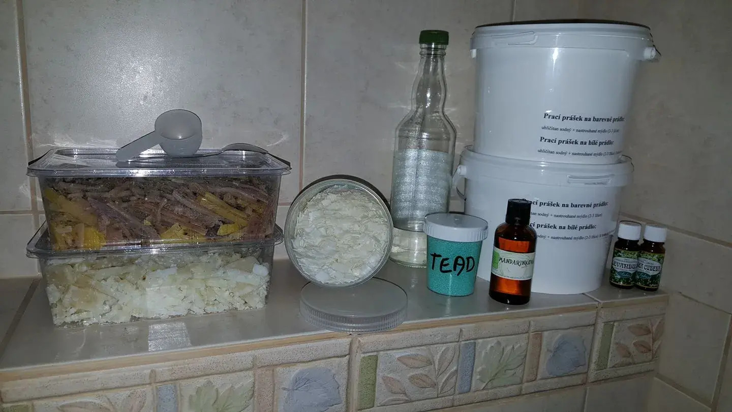 Začínala jsem s nastrouhaným přírodním mýdlem, dnes používám bio tekuté mýdlo s citronovou vůní. Je dobře dostupné v drogeriích.Perkarbonát sodný
